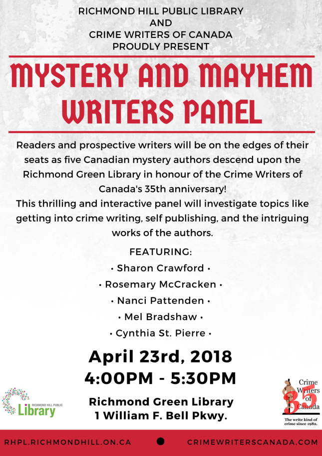 And there is another CWC one Monday, April 23 in the Richmond Green Library in Richmond Hill, Ontario. Five of us crime novelists are on a “crime” panel there. Here are the highlights.
