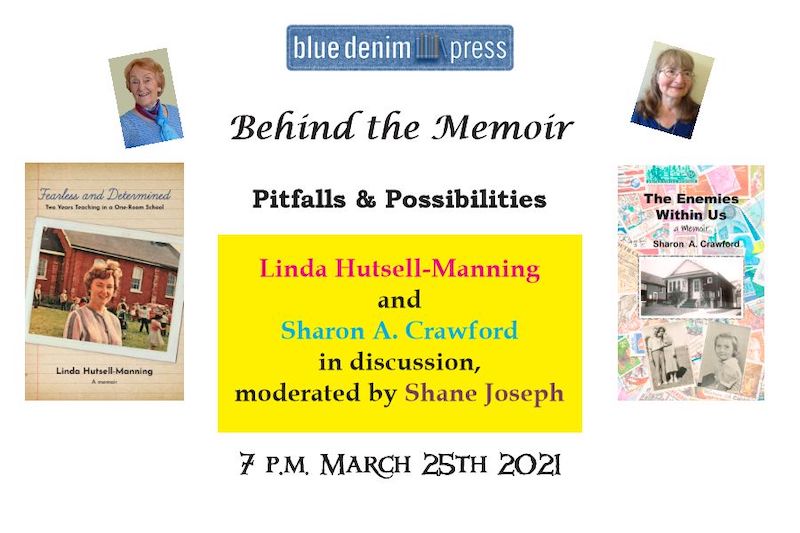 That and a few other pertinent areas of memoir writing will be covered in a memoir writing how to that is being presented by my publisher Blue Denim Press and features two of their published memoir authors, Linda Hutzell-Manning and Sharon A. Crawford (me) spilling the beans about some of the behind-the-scenes of writing a memoir. Our memoirs cover completely different personal stories (as memoirs do), so the circumstances and research cover different, as well as some similar, areas (we do overlap for a couple of years so some news events are the same). One situation that comes up is do you use real names in a memoir? To find out, you will need to attend this free memoir writing presentation. Information is below: